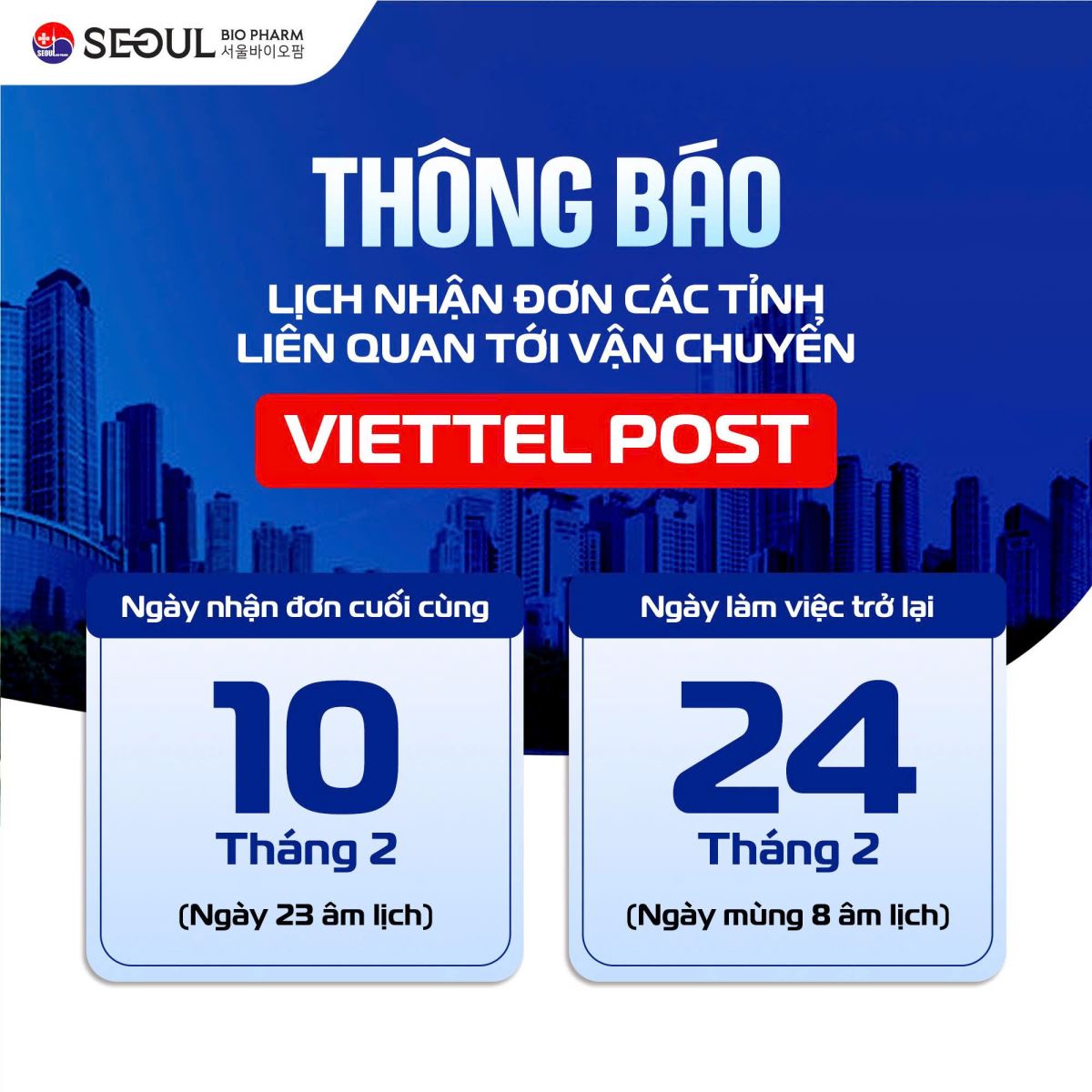Kể từ Thứ 3, ngày 24/02/2026, Seoul Bio Pharma sẽ hoạt động bình thường trở lại và ưu tiên: